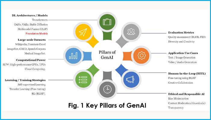 Successful development and deployment of a GenAI solution rests on 8 pillars (see Fig. 1), namely, the deep learning (DL) models; availability of large-scale datasets; access to computational power; design of appropriate training techniques to the DL models; evaluation metrics to measure the quality, creativity and diversity; applications and use cases; human in the loop (HITL) to facilitate collaboration, fi ne-tuning, and lastly framing and adopting ethical and responsible practices.