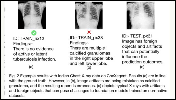 One of the most promising applications of GenAI is in medical imaging and diagnostics. Models like CheXagent interpret chest X-rays, providing automated insights into conditions like tuberculosis and pneumonia1. The Medical SAM2 Model enhances 3D abdominal segmentation, crucial for precise organ localization2. The advent of foundation models has opened unprecedented opportunities of building task-agnostic general models that can be fi ne-tuned for various downstream tasks3. Foundation models trained on vast multimodal datasets, such as BiomedGPT and Med-Gemini signifi cantly improve medical imaging accuracy and report generation4,5. In Fig. 2, some results from CheXagent with Indian data are depicted6. Results from the experiments using Indian data on foundation models trained on North