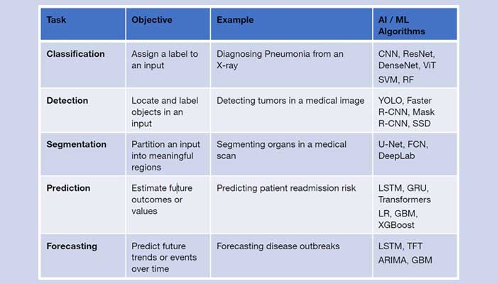 Note: SSD: Single-Shot Detector, consists of a classification backbone + SSD head (another CNN): a method for detecting objects in images using a single deep neural network; GBM: Gradient Boosting Machine; XGBoost: Extreme Gradient Boosting; Faster (Region-based CNN) R-CNN predicts object class and bounding boxes, while Mask R-CNN is an extension that adds pixel-level segmentation, both are object detection algorithms that use regions to localize objects in an image; FCN: Fully Convolutional Network, type of CNN used for image segmentation; TFT: Temporal Fusion Transformer