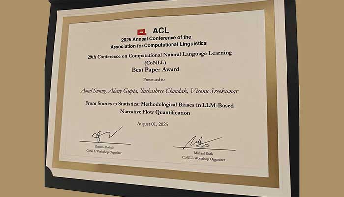 Research work done on identifying methodological biases in a widely used large language model (LLM)-based metric for evaluating narrative flow (Sap et al., 2022, PNAS) by Amal Sunny, a CSD dual-degree student working under the supervision of Dr. Vishnu Sreekumar was awarded the Best Paper Award at the 29th Conference on Computational Natural Language Learning (CoNLL 2025), co-located with ACL 2025 in Vienna, Austria.