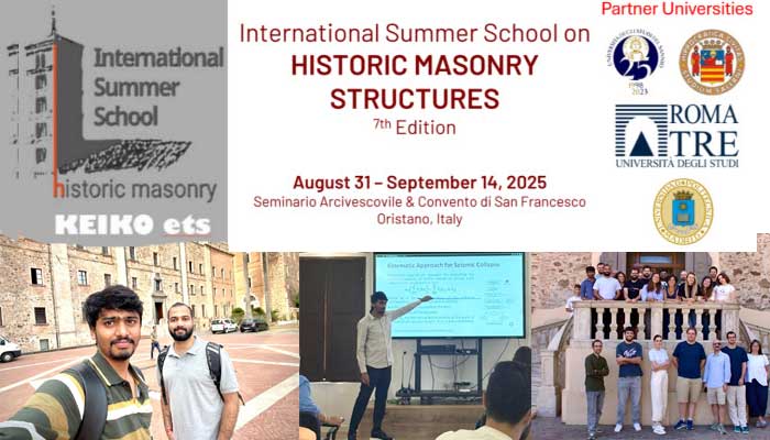 Rohan Vashisht pursuing Ph.D with Dr. P Pravin Kumar Venkat Rao and Raj Kumar Kanukuntla pursuing Ph.D with Dr. Jofin George were selected to participate in the 7th Edition of the International Summer School on Historic Masonry Structures (HIMASS), held in Oristano, Italy, from 31 August to 14 September 2025. Notably, they were among only 21 students worldwide chosen for this prestigious program.